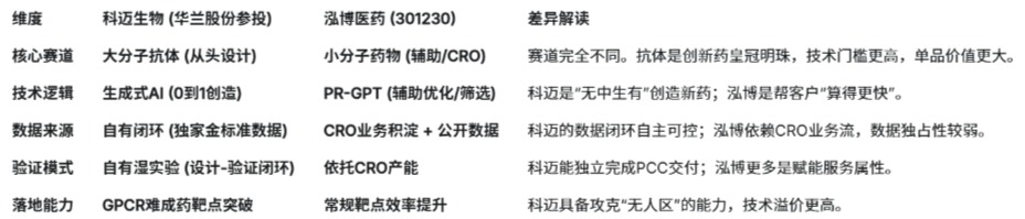 很多投资者分不清AI制药的细分赛道。我们将科迈与A股小分子AI代表泓博医药进行对比,就能看出科迈的稀缺性。