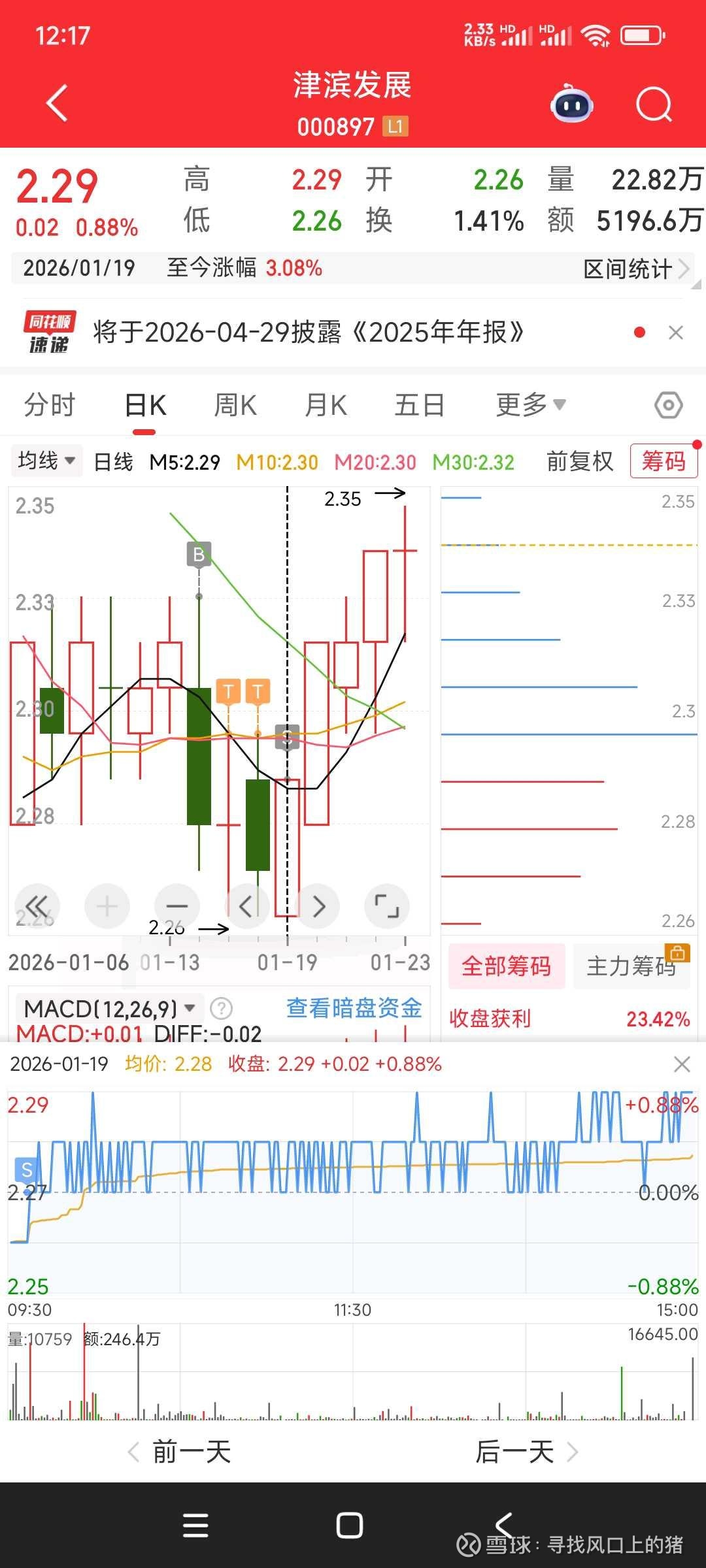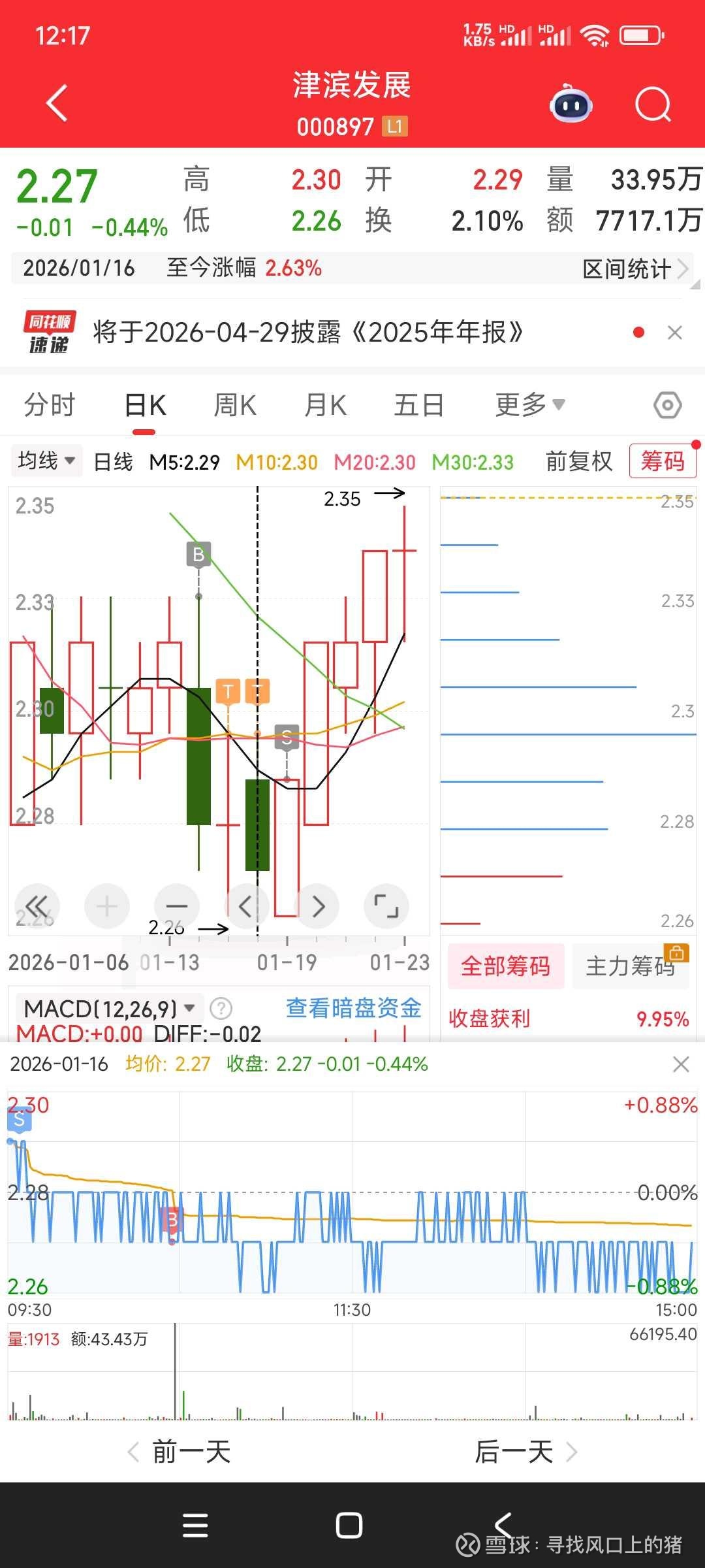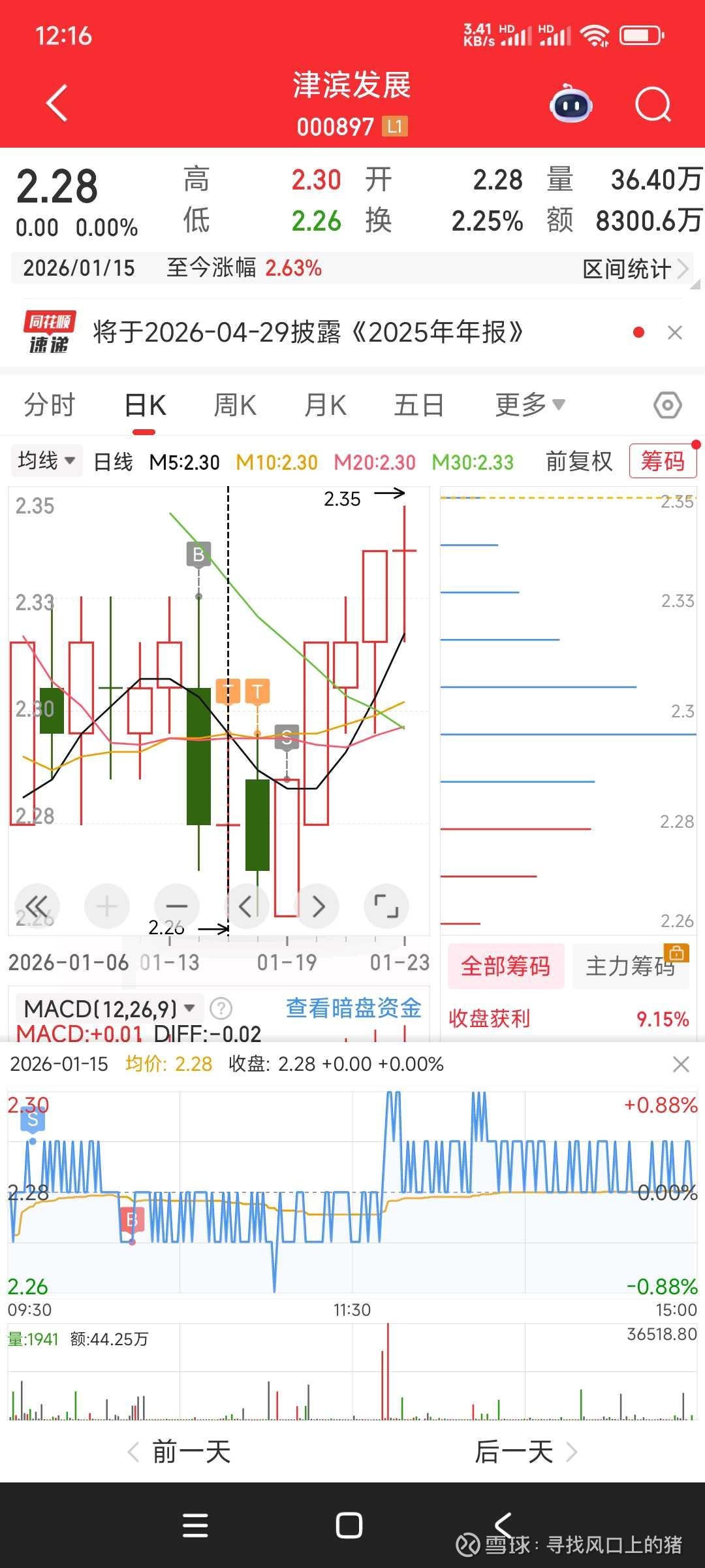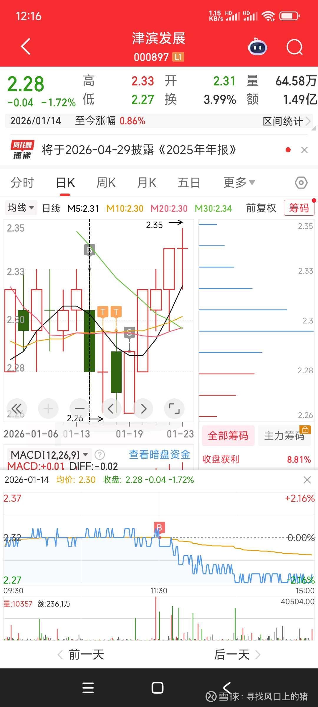 本周收益严重不及预期。上周三中午12点36津滨发展2.32全仓挂单,按纪律应该是给半仓,当时纠结半天,全仓挂单。周四周五做T,周一本来挂单2.28继续做T,看十点的会议能不能带动指数,竞价看大盘和板块有点害怕,2.28撤单改挂2.27,卖出后接不回来了,被迫止损。纪律没有完全遵守,本周强制空仓。共识确定价值,情绪确定溢价,计划自己的交易,交易自己的计划,心态冷静,有机会就买进,没机会就空仓!