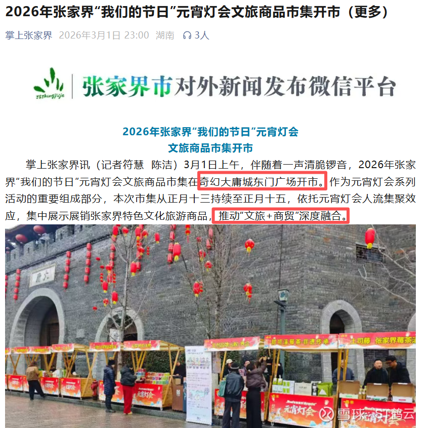 品牌焕新方面,大庸古城正式更名为“奇幻大庸城”,目前临街商铺已对外开放,预计2026年7月1日正式营业,将推动芒果系综艺落地项目,叠加市政府将元宵节主会场定于此,项目的流量预期与政策支持力度可见一斑。