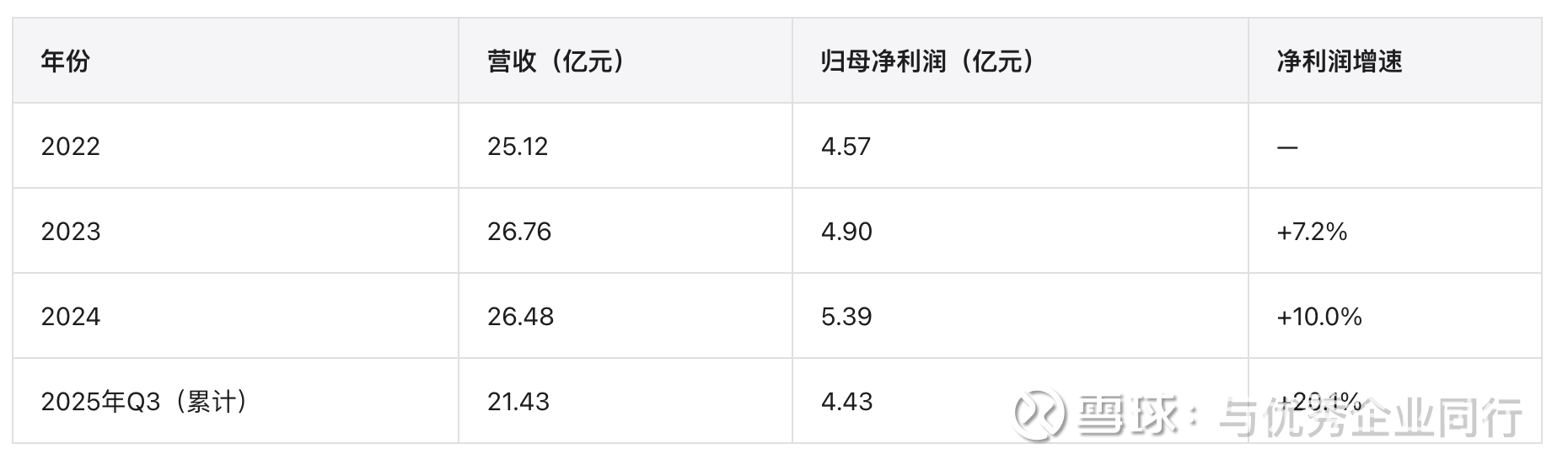 年份营收(亿元)归母净利润(亿元)净利润增速202225.124.57—202326.764.90+7.2%202426.485.39+10.0%2025年Q3(累计)21.434.43+20.1%