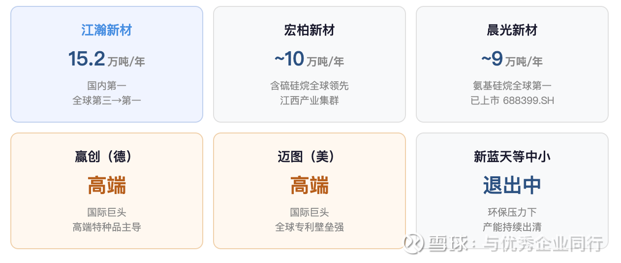功能性硅烷生产有明显规模效应——装置越大,单位能耗越低,副产物回收率越高。江瀚的15.2万吨产能比第二名宏柏新材大约50%,成本结构天然占优。在价格战里,这一点至关重要。