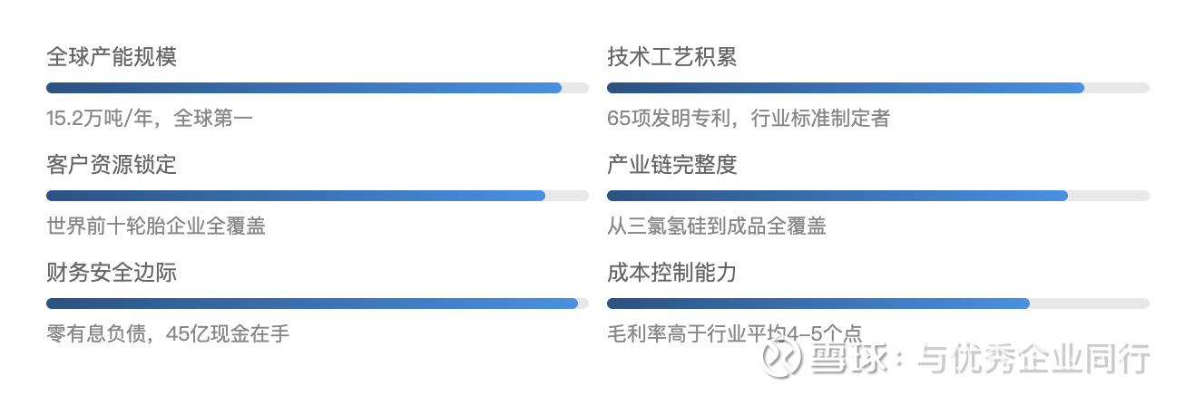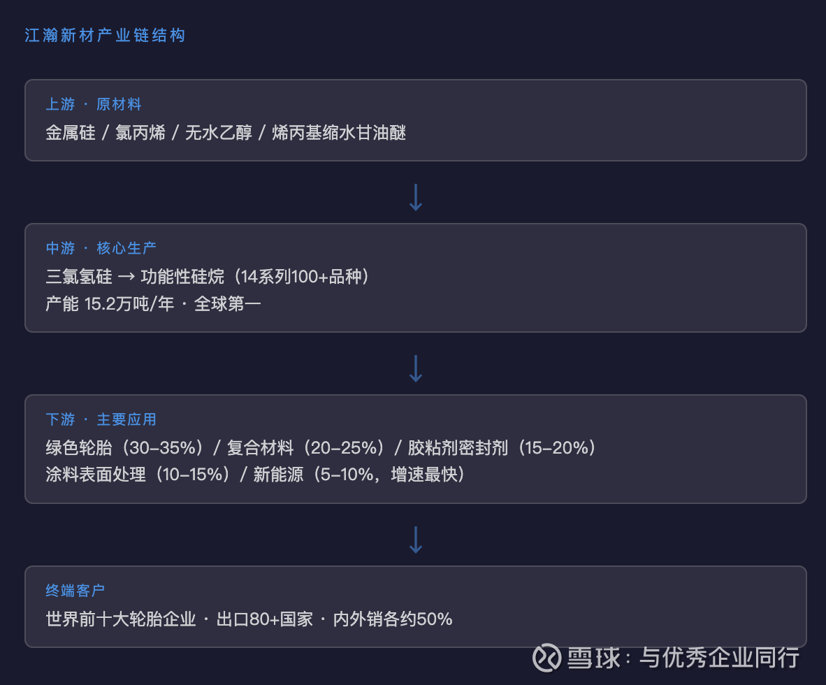 公司卡在产业链中游,是整个链条里最有定价权的位置。上游原材料(硅块、氯丙烯)高度分散,江瀚有足够的采购议价能力;下游轮胎企业对供应商认证周期长达2-3年,一旦进入就不会随便更换——这种粘性保证了订单的稳定性。