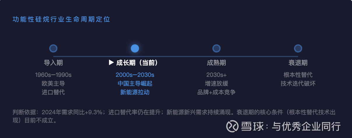 更重要的是,功能性硅烷在可见的未来不存在根本性替代技术。Si-O 键的化学特性决定了它在有机-无机界面改性上的不可替代性,这是材料化学的底层逻辑,不会因为一个新发现就改变。从这个意义上说,这个行业的"衰退期"还很遥远。