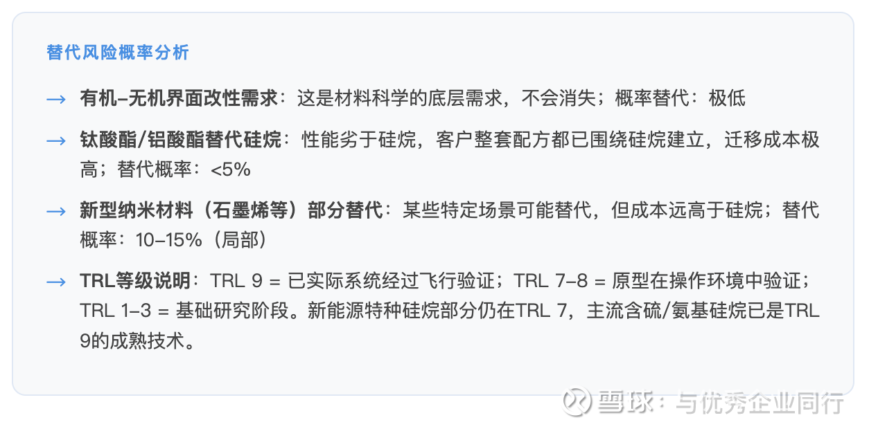 总结一句:功能性硅烷的替代风险在中低端市场几乎为零,在高端特种品领域有被更先进分子替代的可能性,但时间轴在10年以上。更现实的竞争风险是国内同行(宏柏、晨光)在某个细分品类打穿,而不是技术路线的颠覆。