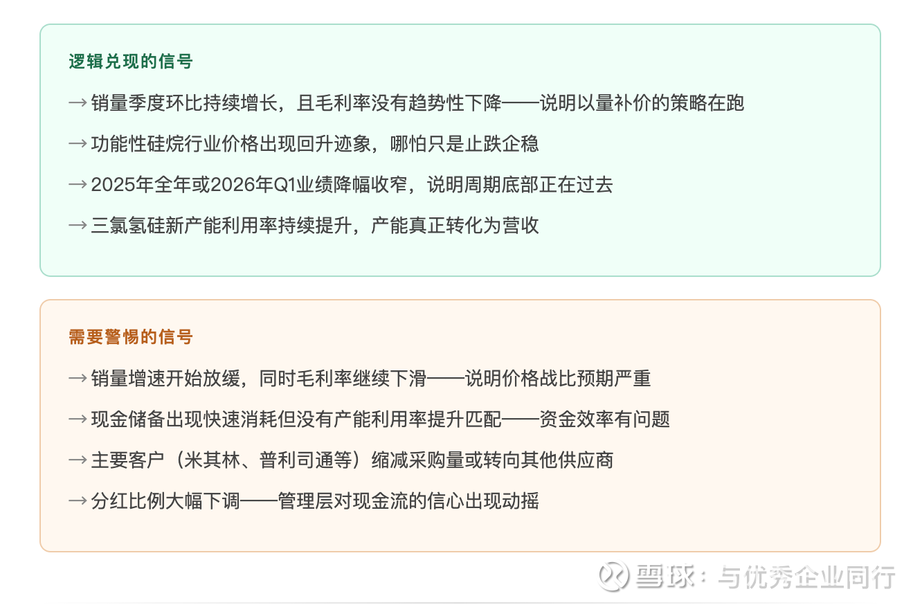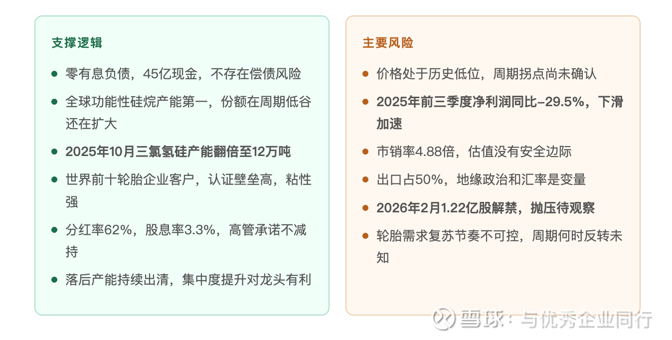 功能性硅烷价格什么时候回升,没有人能准确预判。全球轮胎需求、行业产能出清速度都是变量。目前我们处于"底部左侧"——价格已经很低,但拐点还没确认。在此之前,业绩仍会承压。