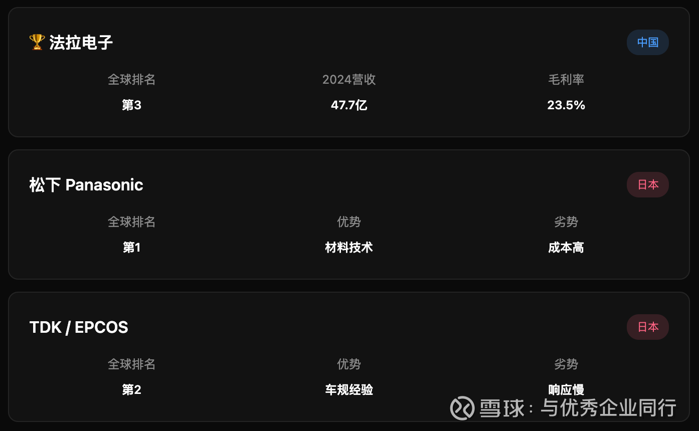 法拉电子的竞争对手主要是日本企业。松下和TDK在高端材料(超薄薄膜)上还有优势,但法拉电子赢在两点:全产业链自主可控(自己做金属化膜)、成本更低响应更快。国产替代的逻辑就在这里。
