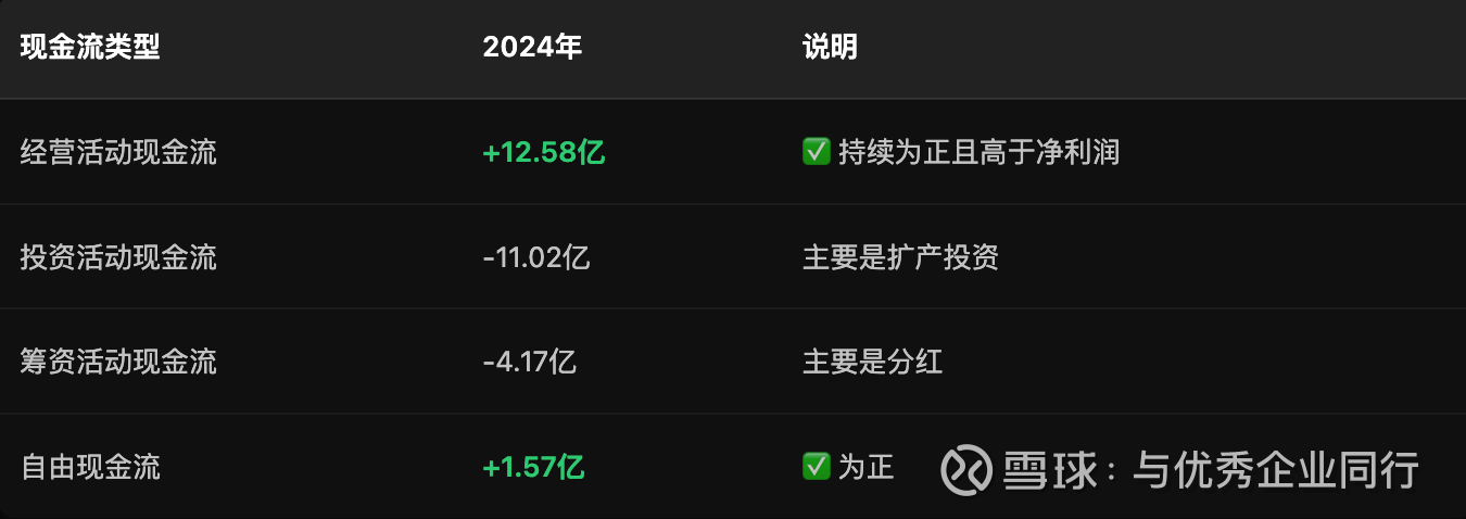 经营现金流12.58亿,净利润10.42亿,现金流/净利润=121%。这说明利润质量很高,赚的是真金白银,不是账面数字。