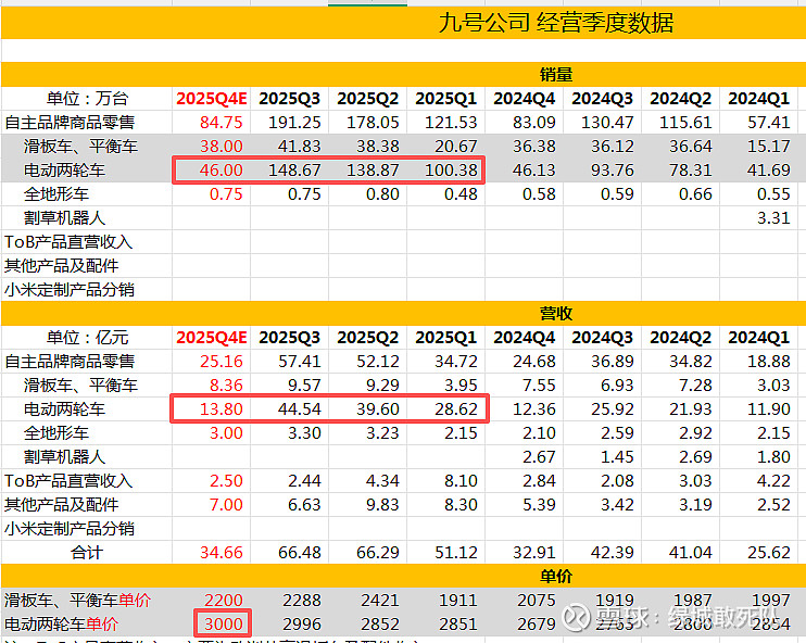 于是我重新测算25Q4业绩。先看营收部分,各项数据都是保守预测,其中电动两轮车Q4按46万台,3000/台测算,13.8营收,营收合计34.66亿元。