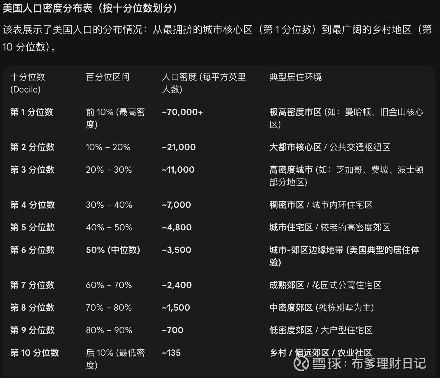 2.多空的争议核心:收入大头在宽带互联,空方观点是看空宽带,认为光纤会持续侵占宽带份额,直到份额归零 (charter 1月份低点的价格对应PE5.5,现在涨了点不过6倍出头,这是按再过四五年公司要破产来定价)。光纤彻底吃掉宽带的逻辑长期起来看说不通。由于2020年开始的超低利率,美国确实出现光纤建设的热潮,过去15年的时间里fiber也的确在持续蚕食宽带的市场份额。即便如此,在2026年当下,如果按照人口密度从高到低把美国分成十等分(denciles),目前人口密度排前50-60%的地方有fiber overbuild(即,在宽带覆盖地区同时铺开光纤)。人口的分布是高度集中的,常识告诉我们光纤也应该从人口偏密集的地方先高密度铺开,而美国的人口密度分布显示密度排在第5个十分位的地区,密度是第八个十分位地区的的3倍(看下表)。也就是说,在光纤成本大头来自变动成本(linear cost 与光纤长度成正比的部分)而非固定成本的(固定成本vs.可变成本大概 2/8开)前提下,去在人口密度第八个十分位地区的铺光纤成本也是约3倍。这对于一个margin 10%的busines显然不可行。简而言之,从现在人口密度排到60%左右的区域往人口更稀疏的地方铺开光纤的ROI是显著降低的。尤其是在已经有宽带“地头蛇”的人口稀疏地区,telco们在此大举overbuild之前会小心衡量。