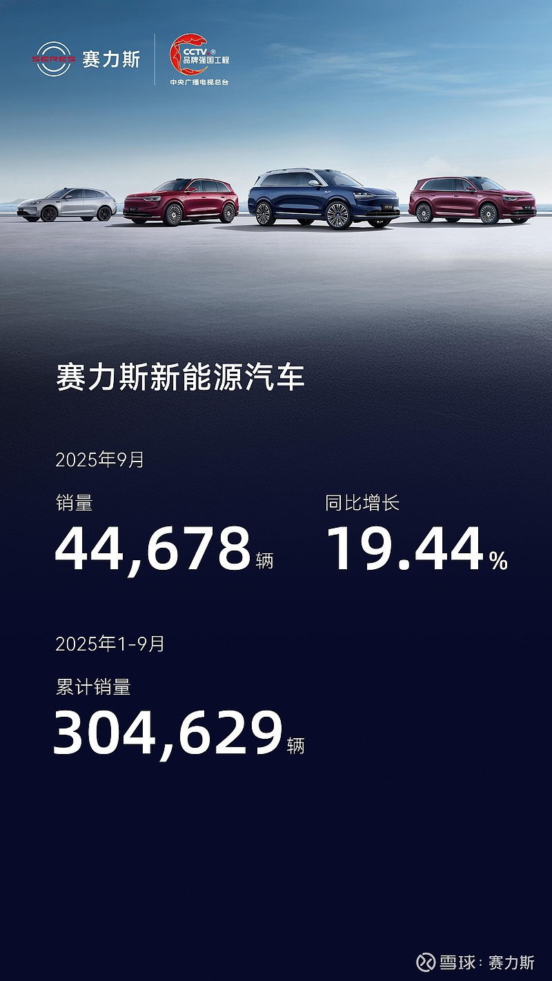 发布9月产销快报。数据显示,赛力斯新能源汽车9月销量44,678辆,同比增长19.44%;今年1-9月累计销量达304,629辆。
