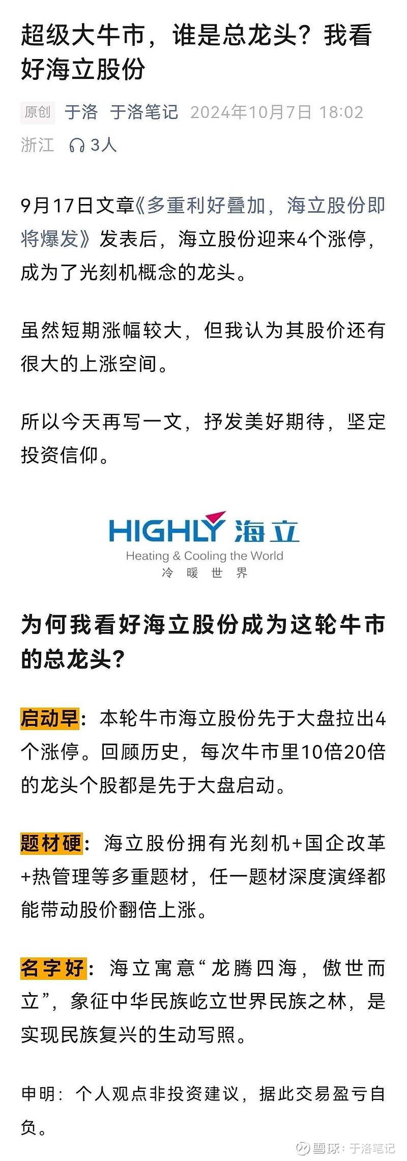$海立股份(SH600619)$ 2024年10月7日我写了一篇文章《超级大牛市,谁是总龙头?我看好海立股份》,简单阐述了我看好海立股份的理由。那一段时间,海立的确是市场龙头。一年多过来了,海立有了几倍的涨幅,但相比其它涨幅更大的标的,海立称不上总龙头。当下牛市行情还在继续,究竟要靠什么样的事件或逻辑催化,海立才有可能再成龙头甚至是总龙头?
