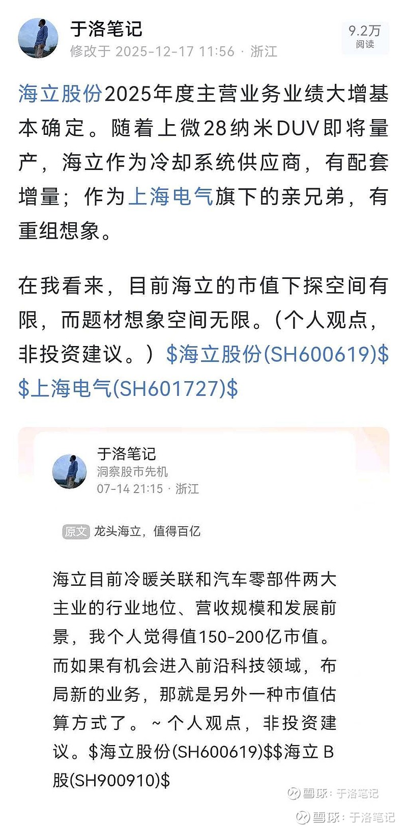 $海立股份(SH600619)$1、 “让资产更值钱”的最直接体现就是股票市值的跃升。2、当下海立股票市值我觉得处于合理区间的下沿(150亿元总市值)。3、希望2026年海立公司通过经营业绩的高增和前沿科技领域的突破,带动海立股票市值攀上新高峰。