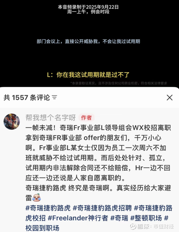 更值得关注的是,当该员工提出质疑时,企业人力资源部门采取冷处理方式,对外则声称其属于 “自愿离职”,截至 12 月 1 日,奇瑞官方及涉事部门尚未对此事作出公开回应。