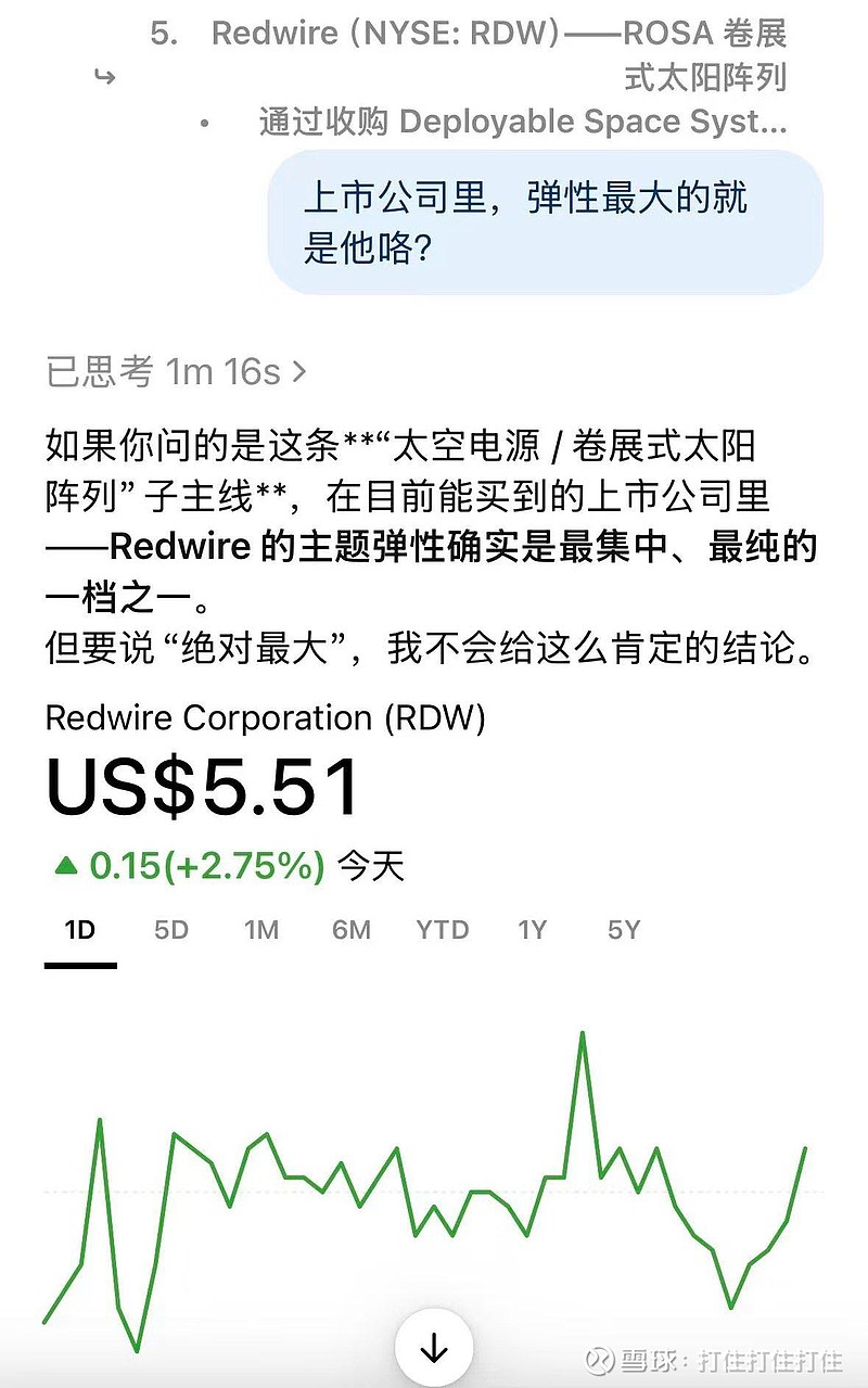 $Redwire(RDW)$SpaceX 要发100万颗卫星,算力卫星需要大量太阳能跟辐射散热板,Redwire 是这俩细分的老大,RDW 要起飞?SpaceX 就算想自研,绕得开 RDW 的专利吗?RDW 可能会像高通收苹果专利费一样,从 SpaceX 身上吃到技术红利?其他巨头们怎么想?亚马逊波音洛马们怎么想,NASA怎么想,要不要让一家独大?大家要不要抢着收购RDW?redwire,5.5的时候发掘的梦中情人股票。