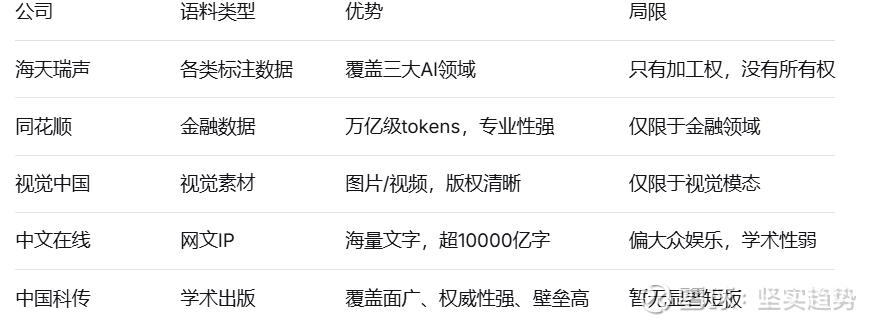 第二类是“垂直领域语料持有者”,比如同花顺、视觉中国、中文在线。