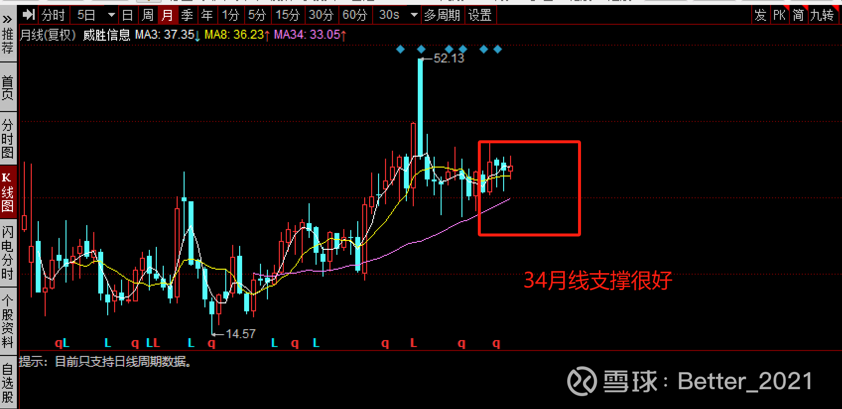 五、技术面,月线有支撑。PE,由于这几年业绩增长,股价没变,消化了前期的高估值,现在处于历史低位。