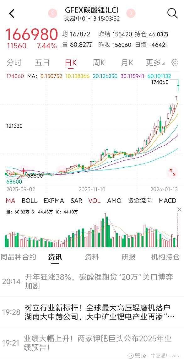 储能和新能源车的利润,在2026年,将被上游涨价所侵蚀。碳酸锂价格3个月,从7万冲到17万一吨。~~~~~~从1月13日,碳酸锂期货主力合约(LC2605)开盘快速涨停,一度冲上17.4万元/吨关口,创近期新高,但午后突发短线下挫,截至收盘日内涨幅缩窄至7%,报16.698万元/吨。$盐湖股份(SZ000792)$ $阳光电源(SZ300274)$ $比亚迪(SZ002594)$#金钱永不眠人性永不变#