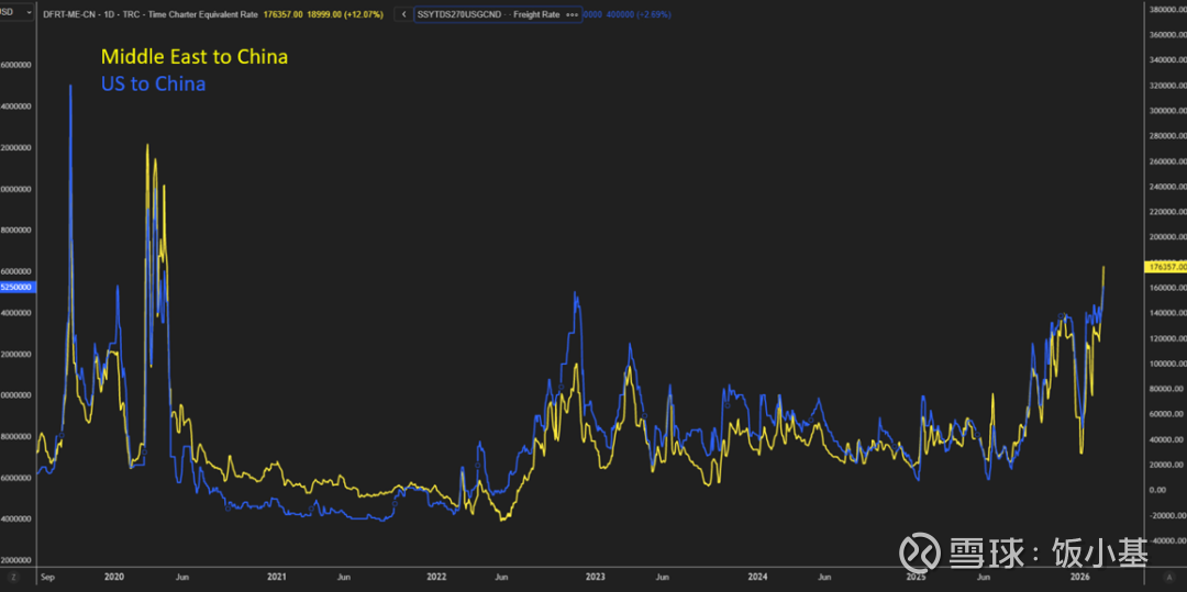 目前租用一艘超大型油轮(VLCC),把中东原油运到中国这边的价格,已经飙升突破每日17万美元。