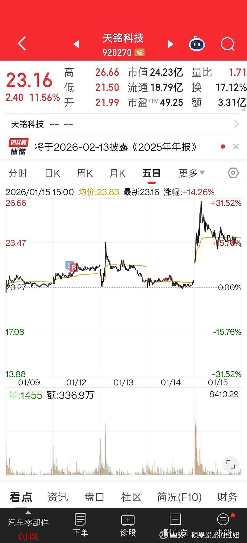 今天靠天铭一个股撑起了整个账户!幸好昨天大加仓,要不然今天被埋了但上午有事,没多看,要不然绝对卖高位😓下午清仓了,一股没留,有位置就回,没位置祝好!(为什么清仓?因为后面的拉升没量了!感觉不妙,保住收益为主!)$天铭科技(BJ920270)$