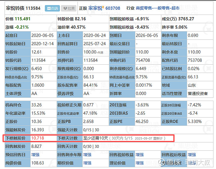 $家家悦(SH603708)$ 再等10个交易日,就能触发下修了。预计10月份下修到底,然后就可以开启化债行情了。