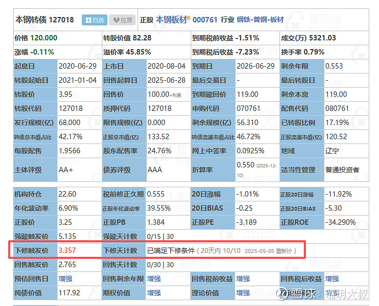 $本钢板材(SZ000761)$ 不知不觉,满足了$本钢转债(SZ127018)$下修的条件。这次下修有可能不?我本来判断公司不会考虑下修,有小伙伴打电话给公司,也验证了我的判断。但非常时期,面临非常巨额的债务(68亿到期可转债),公司自身的资产质量不行,市值管理能力偏弱(有目共睹),恐怕下修成了不得不为之的选项了。今晚揭晓答案。