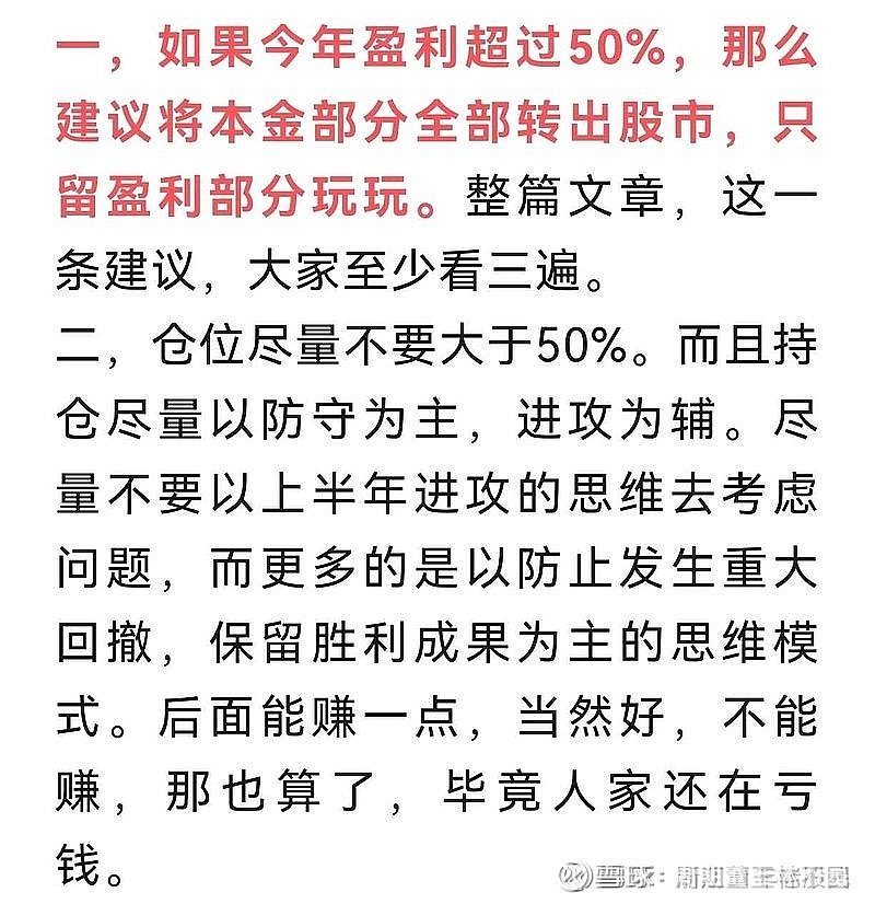 他说如果今年盈利超过50%,那么建议将本金部分全部转出股市,只留盈利部分玩玩,仓位尽量不要大于50%。而且持仓尽量以防守为主,进攻为辅。尽量不要以上半年进攻的思维去考虑问题,而更多的是以防止发生重大回撤,保留胜利成果为主的思维模式。2025年大部分投资者获利相当丰厚。从历史规律来看,每一轮小牛或者大牛的第二年,基本上都非常难过,行情都不太好,处于泡沫消化期,90%以上的投资者是要亏钱的。处在年未这个时间点和空间点,不需要再折腾了,清仓或者降低仓位,保留住胜利成果,安安稳稳过个好年吧。