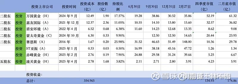 投资万国黄金要早一点,2024 年 9 月:紫金矿业战略入股,12.49持股 17.6%,成为第二大股东。现在万国黄金市值670,17.6%股权价值117亿,两年时间回报近百亿,翻了近10倍,是其最成功的投资。