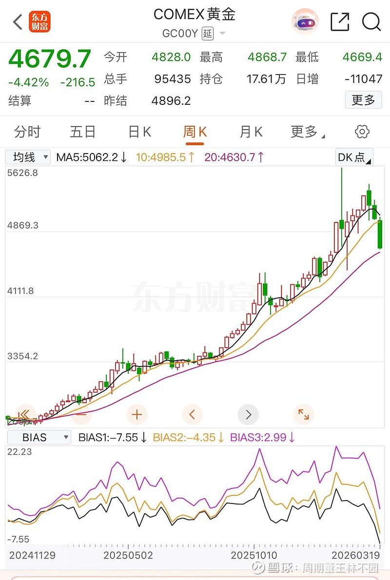 $紫金矿业(SH601899)$收盘后,黄金期货继续杀跌已经破了4700,跌近5%下方就是20周均线支撑从24年11月份开始这条均线就没有破过希望这一次也没有例外能在4600附近止跌企稳今天黄金股跌得太多了实际上已经跌到黄金4千左右的价位了没有必要再悲观了涨多了跌跌多了涨估计明天最后一跌之后就会迎来反弹#黄金# #股票# #林不园# $金诚信(SH603979)$ $湖南黄金(SZ002155)$