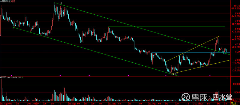 周线。突破这个蓝色压力后的回踩,看着不算特别牢固。此处不能回落再低于3.2(极限可破,收复不算)以下。