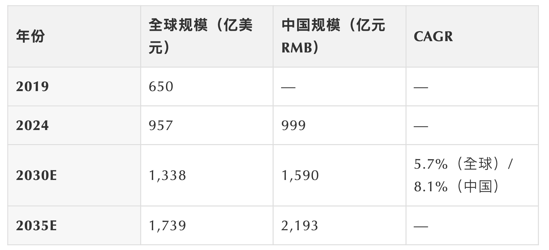 据弗若斯特沙利文数据,全球医学影像检测市场已从2019年的650亿美元增长至2024年的957亿美元,复合年增长率8.1%。展望未来,该市场将于2030年突破1,338亿美元,并在2035年进一步攀升至1,739亿美元。中国市场增速显著高于全球平均水平,2024年规模已达999亿元人民币,2024至2030年CAGR高达8.1%,预计2035年将突破2,193亿元。