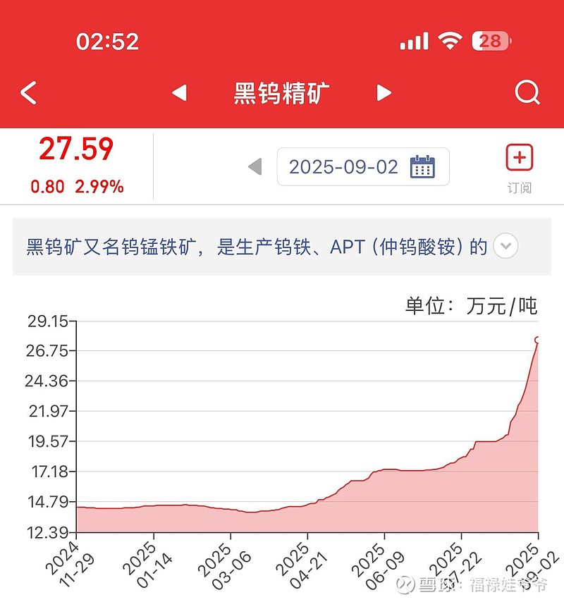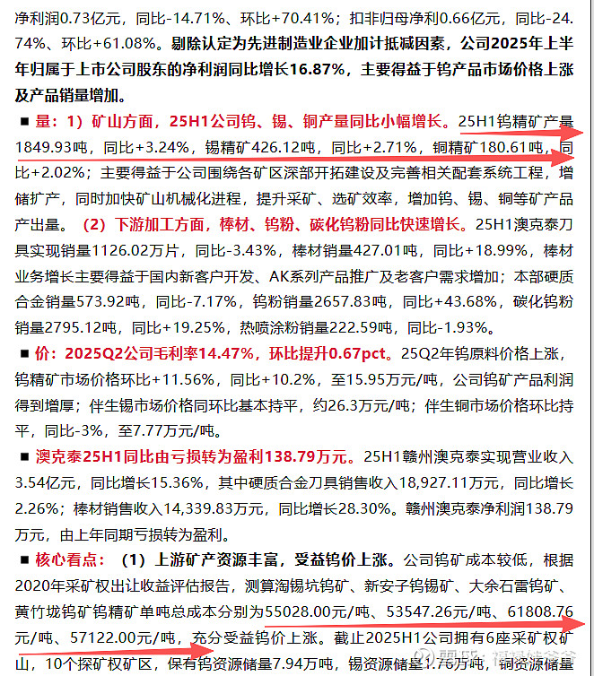 上半年钨精矿均价14万每吨,三季度目前均价是27万每吨,章源钨业这周五到下周二这个时间段会发长协涨价,所以以$章源钨业(SZ002378)$ 为例,钨精矿成本是5.6万每吨(民生研报资料),25H1钨精矿产量1849.93吨,锡精矿426.12吨,铜精矿180.61吨,中报净利润为1.15亿,三季度业绩推测大概在2亿左右,是上半年业绩的2倍,是去年三季度业绩的6倍,今年四季度是去年四季度业绩的8倍,全年业绩大概在5-6亿左右,是去年业绩的3-3.5倍。