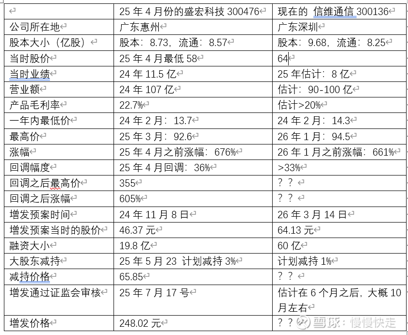 我比较了胜宏科技在25年4月份的时候和现在的信维通信,胜宏科技25年4月之前也是涨幅很大,之后的回调,公司也是增发,之后公司股东减持3%,无论公司的股本大小,公司当时所在的行业,产能扩张等都和现在的信维通信高度的相似,做了一个表格直观的比较,只是给大家作为参考,刻舟求剑,供大家乐一乐。