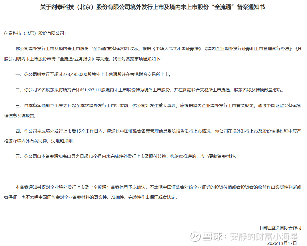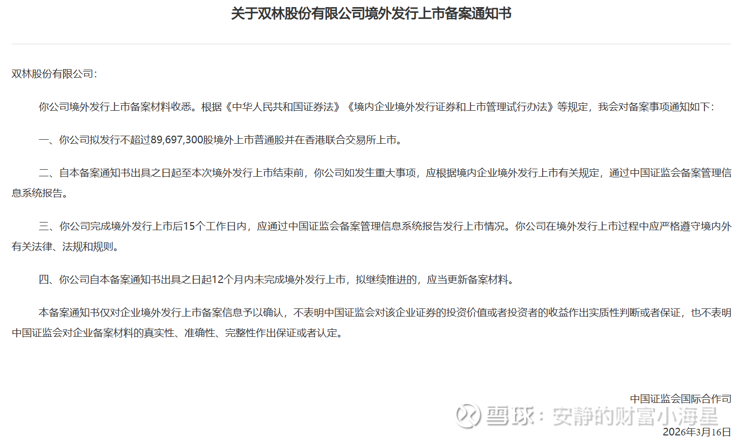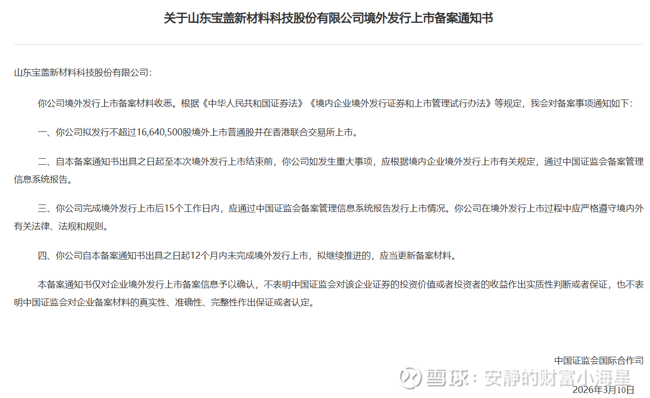 2026年3月23日晚,中国证监会对宝盖新材、双林股份、剂泰科技境内企业境外发行上市予以确认,3家均为赴港上市备案。具体如下: