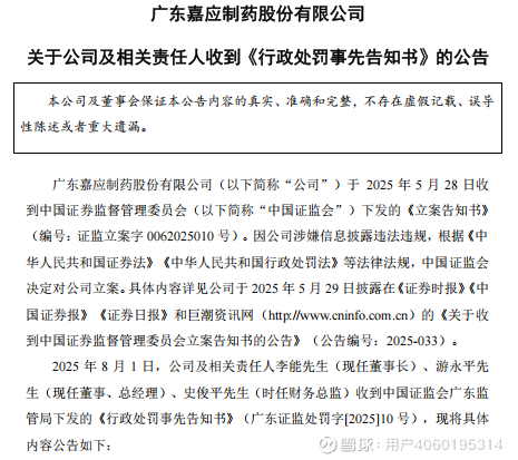 8月3日晚间,嘉应制药(002198.SZ)公告称,公司及相关责任人李能(现任董事长)、游永平(现任董事、总经理)和史俊平(时任财务总监)于8月1日收到广东证监局下发的《行政处罚事先告知书》。因近2.2亿元关联资金拆借(拆借时间2024年10月至2025年1月)未及时披露等,公司及上述责任人被给予警告,并处以罚单。