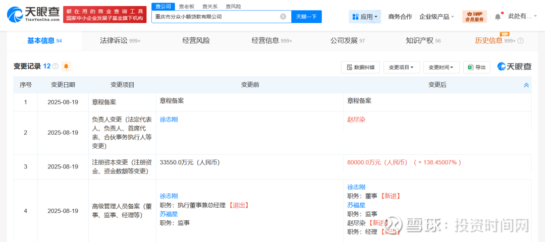 天眼查工商信息显示,近日,分众小贷关联公司重庆市分众小额贷款有限公司发生工商变更,徐志刚卸任法定代表人并由执行董事兼总经理变更为董事,赵尽染接任法定代表人并担任经理,同时,注册资本由约3.36亿人民币增至8亿人民币,增幅约138%。