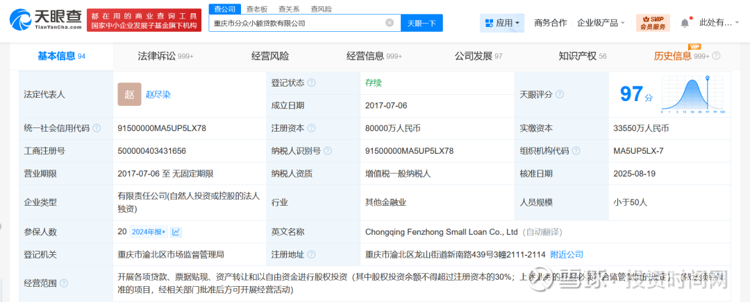 重庆市分众小额贷款有限公司成立于2017年7月,经营范围含开展各项贷款、票据贴现、资产转让和以自由资金进行股权投资。股权全景穿透图显示,该公司由上海数禾信息科技有限公司全资持股,后者由分众传媒(002027)旗下上海时众信息技术有限公司以及宁波数汇股权投资管理合伙企业(有限合伙)、宁波数合股权投资管理合伙企业(有限合伙)等共同持股。