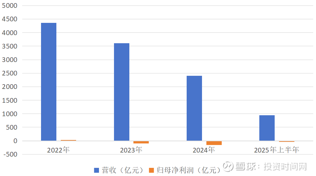 过去几年,公司营收持续下滑,由2021年的5442.86亿元(财报数据,下同)降至2024年的2406.40亿元;2022年至2024年,公司归母净利润由盈转亏,分别录得逾10亿元、-95.56亿元、-155.52亿元,亏损额也逐年扩大。