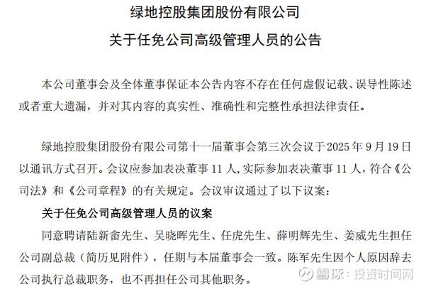 近日,绿地控股集团股份有限公司(下称绿地控股,600606.SH)发布的《关于任免公司高级管理人员的公告》显示,陈军因个人原因辞去执行总裁职务,也不再担任公司其他职务;同时,董事会同意聘请陆新畬、吴晓晖、任虎等五人担任公司副总裁,任期与本届董事会一致。