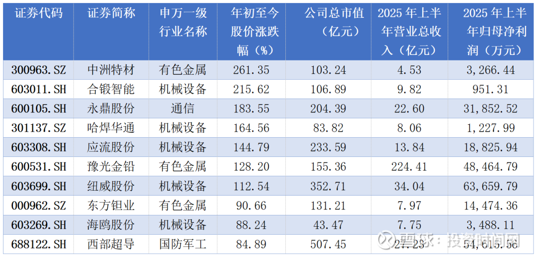 2025年以来中洲特材股价涨幅最高,达261.35%,紧随其后的是合锻智能,涨幅为215.62%