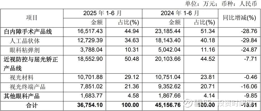 昊海生科2025年上半年按具体产品类别划分的眼科产品收入情况