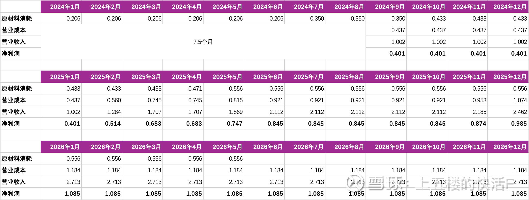 所以,我们只要算出每个月消耗的原材料,即可得出7.5个月后的当月净利润。