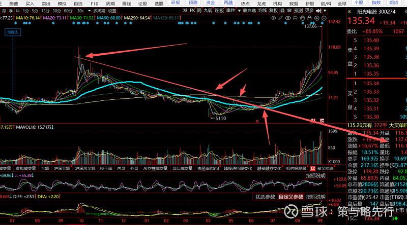 高低切时常见的做法,切低位要搞清楚,切换的方向可能性大不大,低位的持续性如何。更不是高位已经下来了才开始。阳光电源下降通道突破后就已经可以开始做浪型了