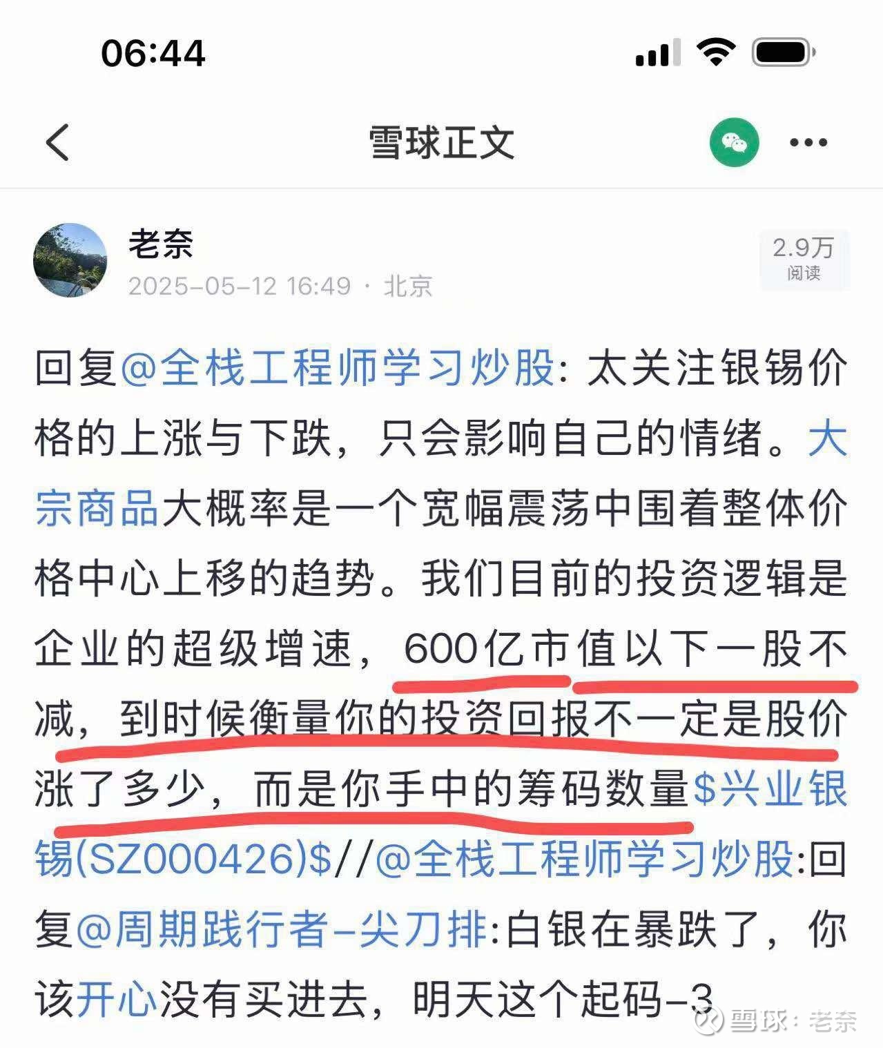 回复@老奈: 兴业银锡,吹过的牛逼一个个实现,600亿以下一股不卖,做到了。1000亿以下一股不卖,也决会做到。