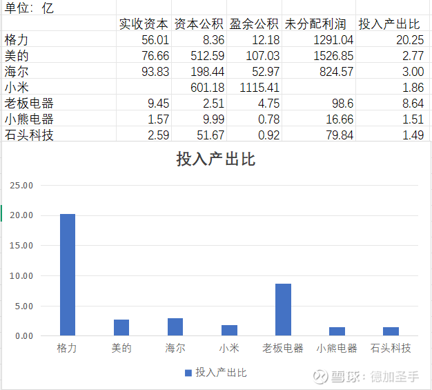 白色家电里,之所以暖通空调是个一流赛道,而其他小家电基本可以归纳到烂赛道里,这个公式是可以说明问题的。我不仅选取格美海和小米作为比较,还加入了厨房电器、清洁电器及小家电的代表公司,我觉得更能突显暖通空调的行业价值量,得到下图: (需要特别说明的是,港股公司由于会计制度不同 导致科目和A股报表有所区别,只能粗略理解为,港股公司的报表中,股本、股份溢价大致等同于我们的投入资本,而回报部分在港股报表里表现为保留溢利,也有可能有一部分被汇总到更广义的“储备”项目之下,综合一些我看过的港股报表实际情况,我认为将报表中的“总股本+股份溢利”看做A股的“实收资本+资本公积”,将“保留溢利”视同A股的“盈余公积+未分配利润”,具备一定合理性。港股公司中报没有这些数据,所以按小米2024年年报数据为准)。
