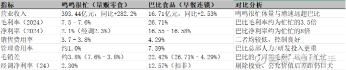 这张图直观呈现了两种业态在盈利质量上的本质差异:忙忙的点落在(毛利率7.6%,净利率2.1%)的低位,而巴比食品的点位于(毛利率26.71%,净利率16.58%)的高位;两者在横轴与纵轴上均存在3–8倍量级的差距。我认为这种差距说明了两点:一、鸣鸣很忙几乎没有加价空间,他每卖出一块钱货,只能留下7–8分钱毛利,再扣掉销售与管理费用后只剩2分钱左右净利润;一旦客流或价格出现小幅波动,利润会被迅速吞噬;二、巴比则每一块钱收入能拿下约27分钱毛利、16分钱净利,不仅具备抵御成本与需求波动的安全垫,也给加盟商和公司本身留出了长期经营和再投入空间。盈利维度财务数据对比: