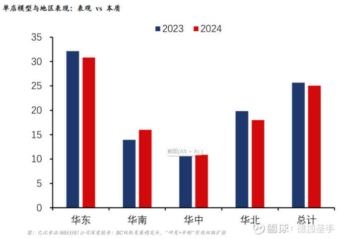 再看巴比,属于典型的冷链+速冻+预制+门店终端模式,SKU相对集中在面米、馅料等主食领域,存货周转率2024年约17.7次/年(对应存货周转天数约20天),低于鸣鸣很忙,但对餐饮快消品而言已经是合理偏快水平,再配合其高毛利率26.71%和高净利率16.58%,巴比不需要像鸣鸣很忙那样去“压极致周转”,也能获得充沛的利润和现金流,可以概括为低周转但高利润的“现金牛”。根据年报,巴比2024年各区域单店收入在11–31万元/年(特许加盟供货收入口径),总体约为25万元/年,略低于2023年的26万元,单店营收在24年呈继续下降趋势: