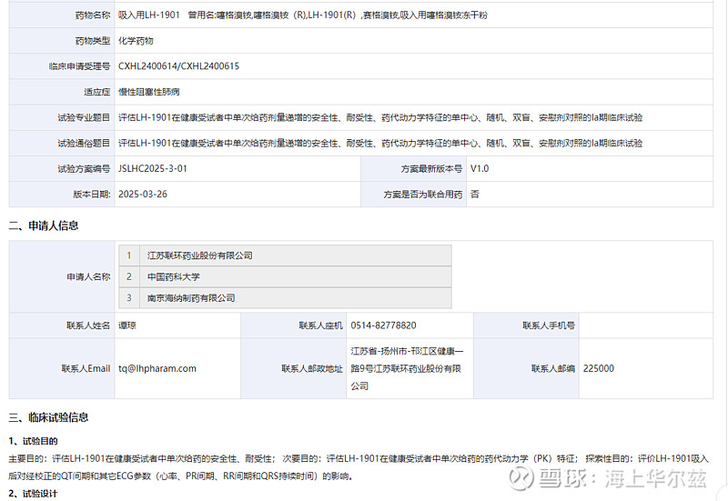 从中国药物临床申报平台获悉,联环药业自主研发的针对COPD慢性阻塞性肺病的吸入用LH-1901进入Ia期临床。
