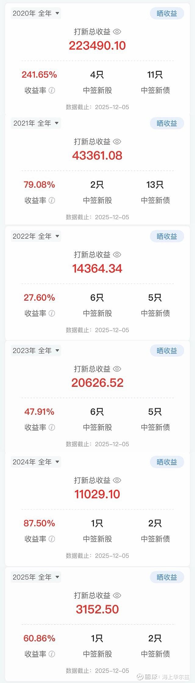 最近今年中签情况,应该很一般吧。当年还是感谢三人行,一签21万,然后是长龄液压,铜冠铜箔,泰凌微,晶合集成,绿联科技。现在看,如果都不选择卖出,几乎清一色三五倍股。记得当年20年21年有炒作次新股的阶段,就是买18,19年上市三年的新股。如今再看,20年21年22年上市的医药股是多么的悲哀。$三人行(SH605168)$$长龄液压(SH605389)$ $泰凌微(SH688591)$