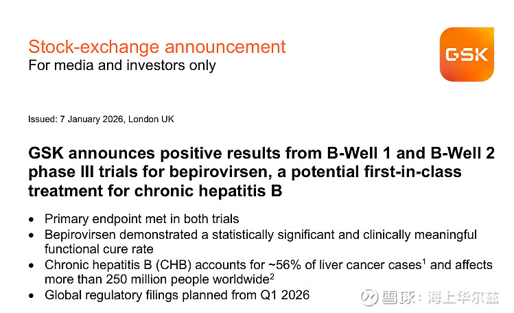 1月7日,葛兰素史克(GSK)宣布Bepirovirsen治疗慢性乙肝的两项III期研究(B-Well 1和B-Well 2)取得了积极结果。该药物是慢性乙肝领域首款完成III期研究的小核酸药物。GSK认为,Bepirovirsen有望成为首款实现慢性乙肝功能性治愈的药物,已计划今年一季度在全球范围内提交其上市申请。
