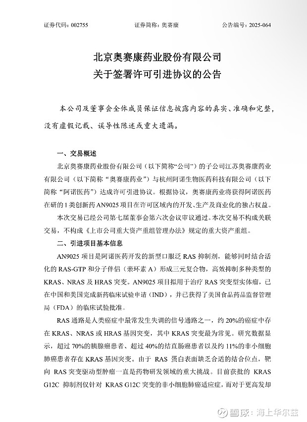 2025年12月29日,北京奥赛康药业宣布其子公司江苏奥赛康药业已与杭州阿诺生物医药科技有限公司签署许可引进协议,获得在研1类创新药AN9025在中国大陆、香港及澳门的独家权益,交易总金额最高达16.33亿元人民币。